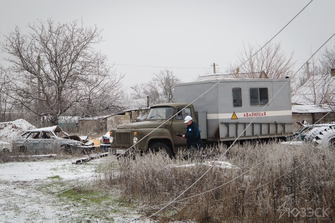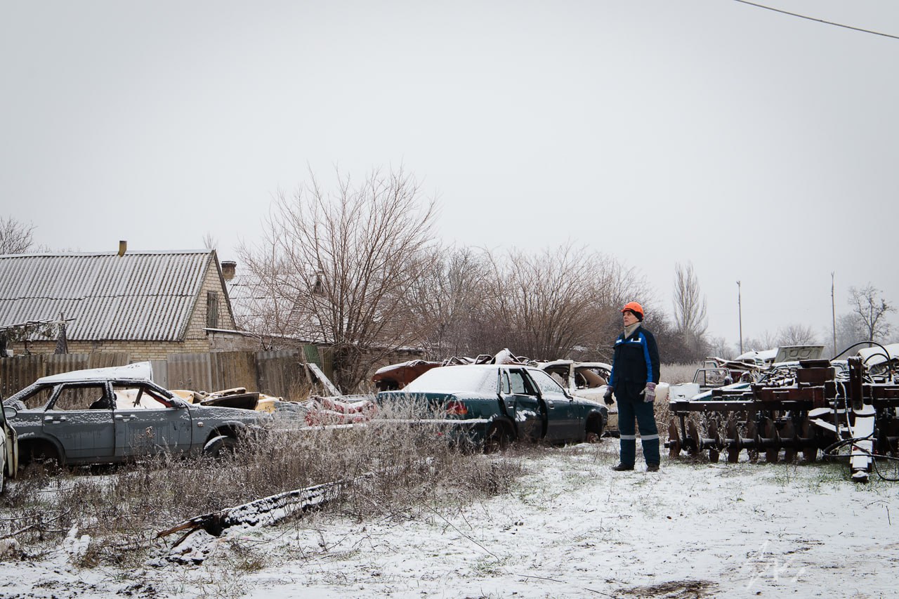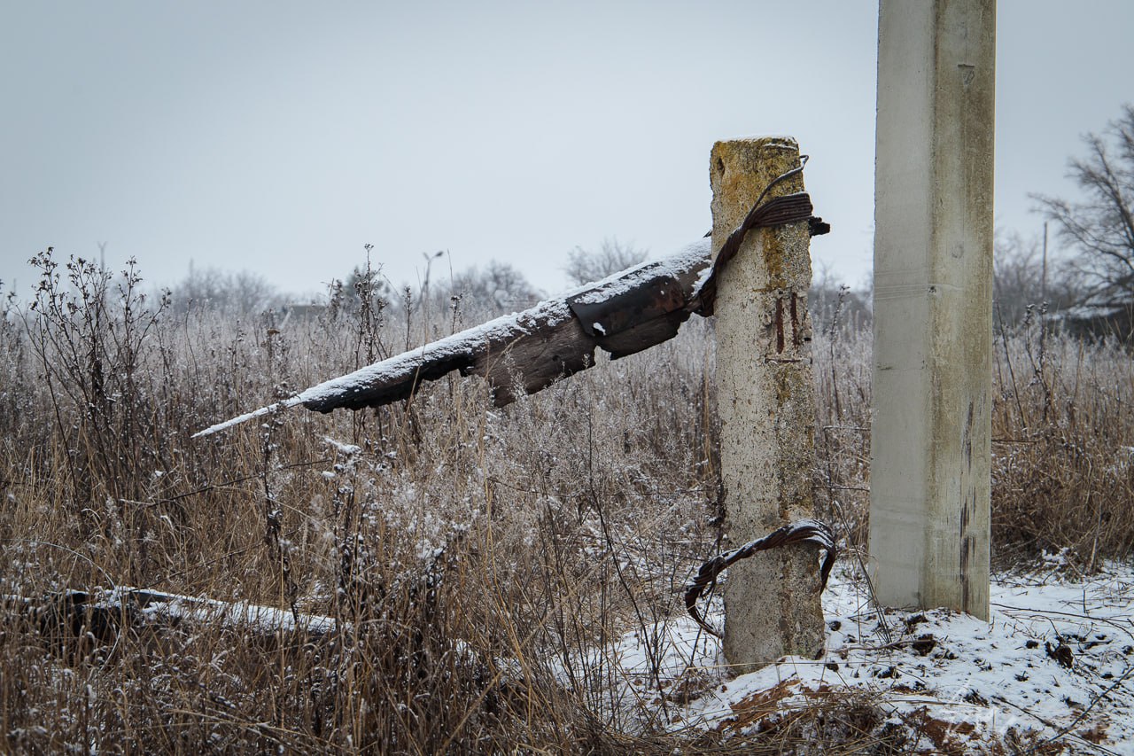 Восстановление освобожденных территорий не останавливается ни на день. Трудности подстерегают бригаду на каждом шагу, в целости подъехать к месту выполнения работ целиком зависит от опыта и мужества водителя. Бездорожье, местами гигантские канавы заполненные водой, которые объехать можно только по густым зарослям обочин. По дороге можно наткнуться на части разбитой техники. Пресс-служба, когда выезжала на съемку бригады Волновахского РЭС, оставила машину на полпути на нашем Daewoo Lanos доехать к бригаде шансов не было. А еще мы пробили колесо и благодаря собранности нашего водителя Виталика, его выносливости и морозостойкости мы поменяли колесо в поле на семи ветрах.